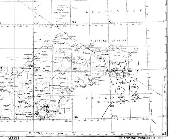 | 美軍事後根據日軍提供的水雷位置圖,繪製了9月5日進出基隆港的航線圖(點擊可以放大)。兩端有小圈圈的線段代表雷區,可見美軍上午是穿越雷區進入基隆港,但回程就避開雷區,往東南東方離開。 |
